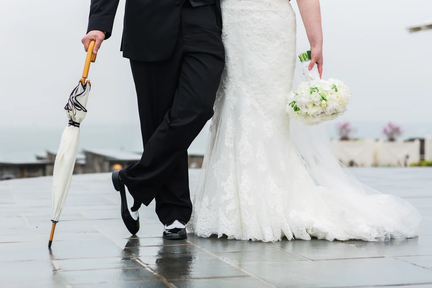 Their ceremony took place at St. Luke's Church in Barrington RI. Heartfelt emotion swept the crowd as they whisked away to their stunning reception at the Castle Hill Inn in Newport RI. They didn't let a little rain stop their fun as we walked the grounds. The cool misty day perfectly complimented the navy blue nautical theme with hints of spring in their white, pink and yellow flowers. Kara looked like a goddess in her gown and pure white bouquet. So in love with her custom made shrug which tied everything together and gave it an air of elegance.